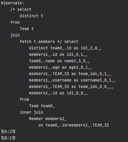 일대다 fetchjoin에서 distinct를 사용하면 같은 식별자를 가진 Team 객체를 제거해 주어 Team 정보가 중복되는 것을 방지할 수 있다.