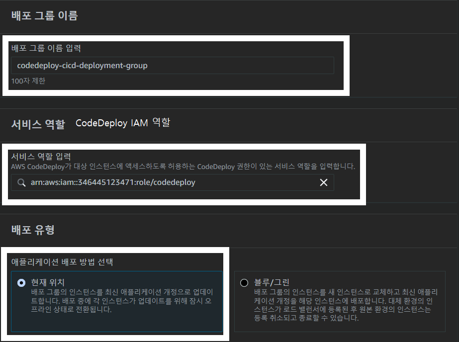원하는 배포그룹 이름을 입력하고 서비스역할에는 이전 글에서 만들었던 CodeDeploy IAM 역할을 입력합니다.