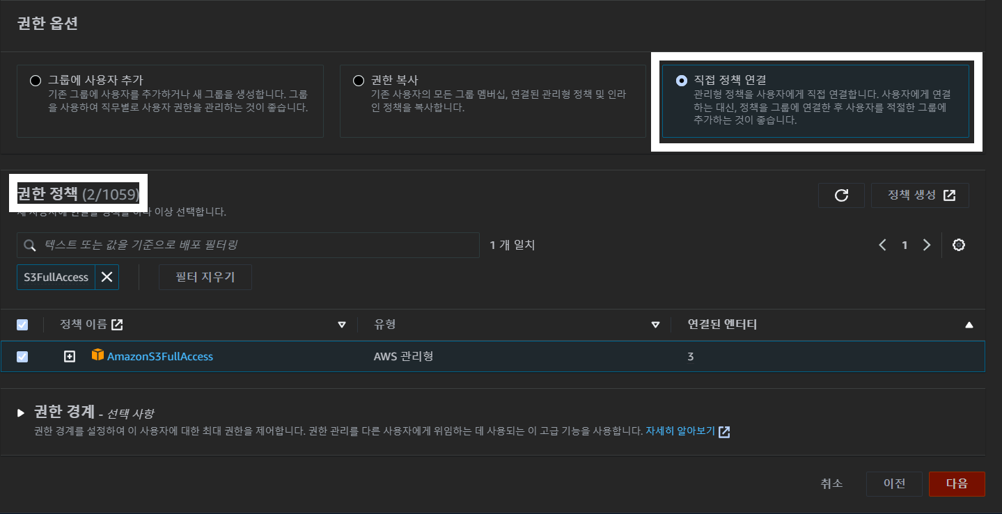 AmazonS3FullAccess와 AmazonCodeDeployFullAccess 권한정책을 연결합니다