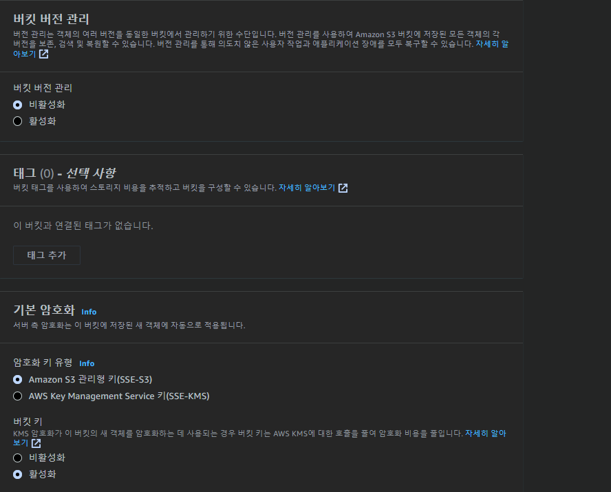 버킷버전관리,기본암호화 설정을 하고 버킷을 생성합니다.