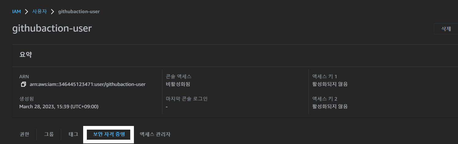AWS를 githubaction Workflow에서 사용하려면 권한이 필요하기 때문에 IAM 사용자를 추가합니다.