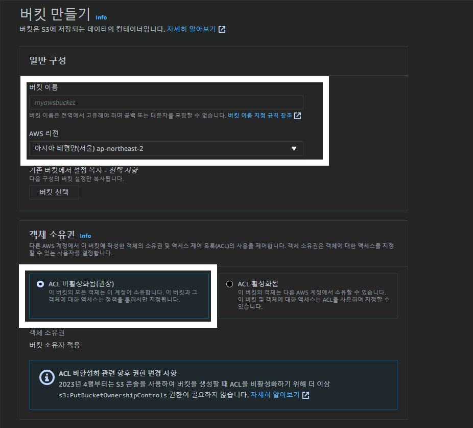 (1)버킷이름,AWS리전,객체 소유권 설정