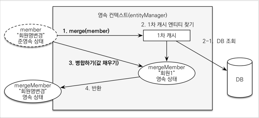변경감지를 이용하면 원하는 속성만 선택해서 변경 할 수 있지만 ,병합을 사용하면 모든 속성이 변경되므로 병합시 값이 없으면 null로 업데이트 할 위험이 있다.엔티티를 변경할때는 무조건 변경감지를 이용해야 한다.