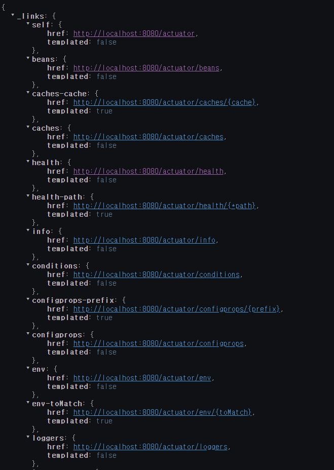 3. 웹에서 Actuator 기능 확인(로컬 기준:localhost:8080/actuator)