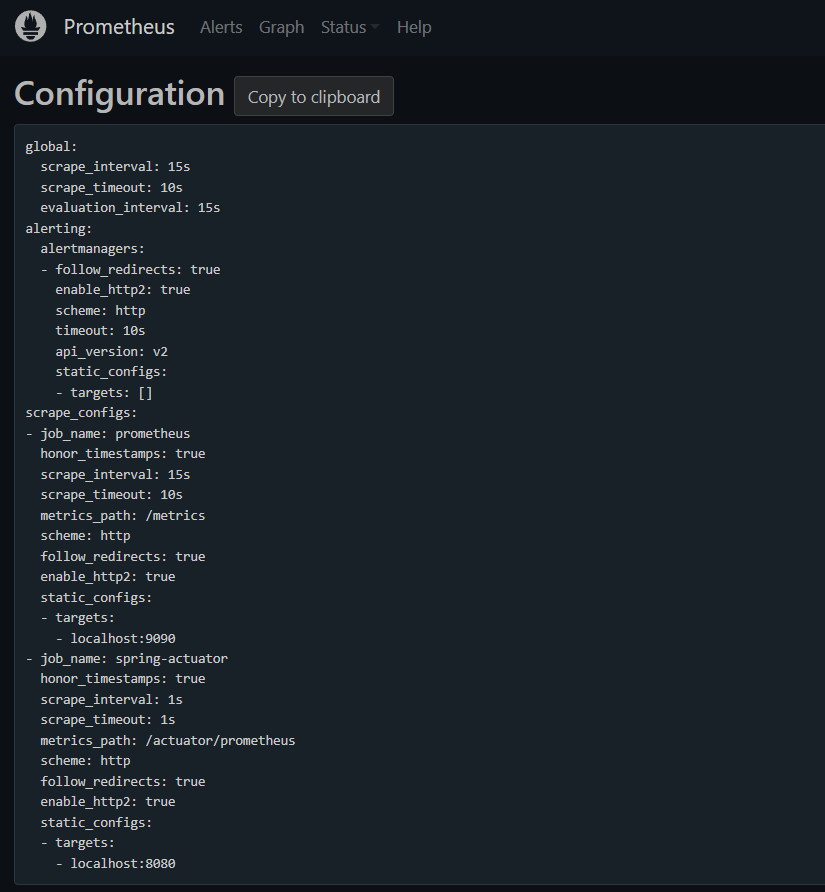 localhost:9090/config와 localhost:9090/targets에 들어가 yml에 파일에 설정한 코드가 제대로 적용 되었는지 확인한다.