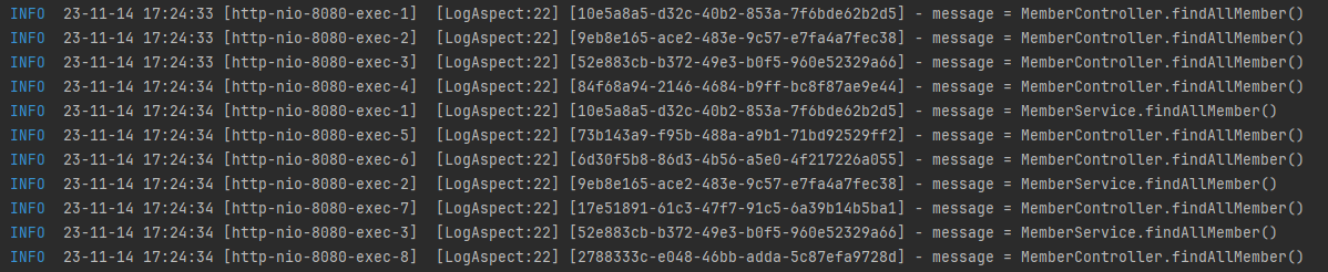 log에서 uuid를 통해 동일한 요청을 분리하기 쉬워진것을 볼 수 있다.