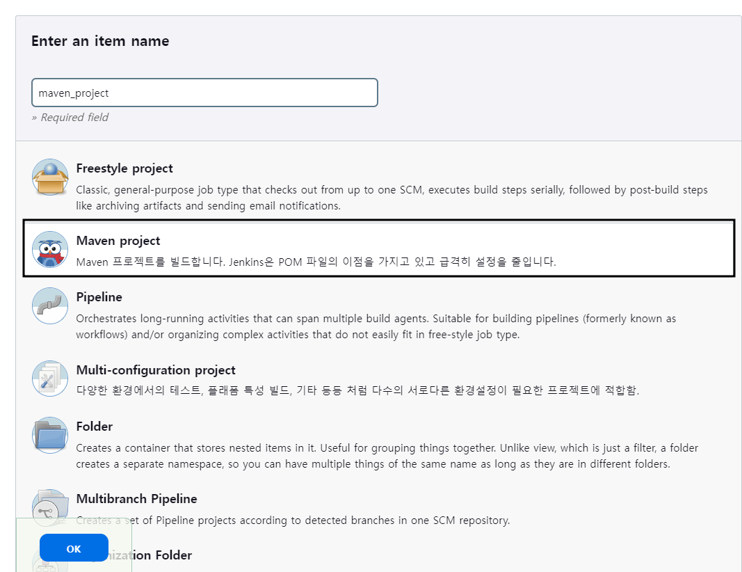 project이름을 입력하고 Maven project로 아이템을 생성합니다.