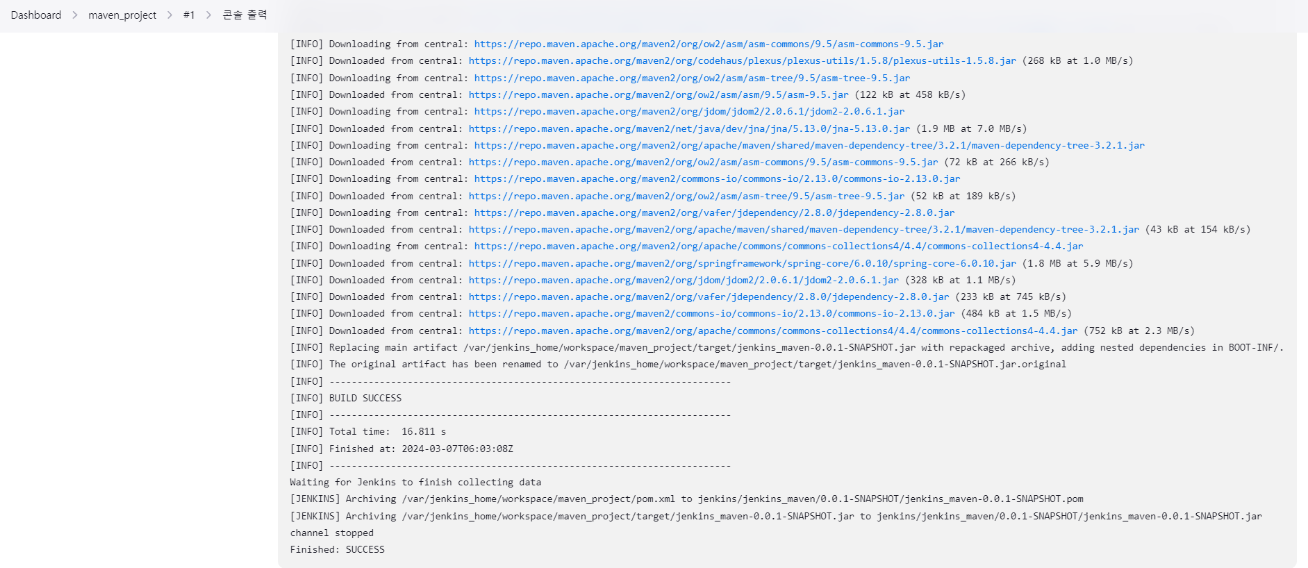 지금빌드 -> Console Output에서 빌드가 성공되었는지 확인합니다.