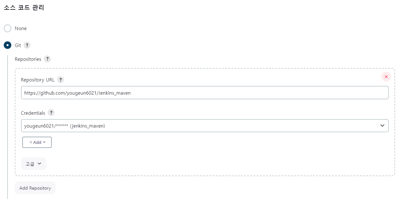 소스코드 관리에서 git을 클릭하고 Repository URL과 Credentials를 설정해줍니다.