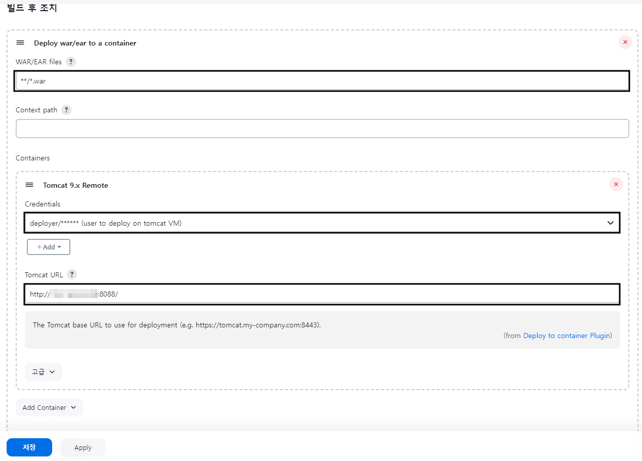 War/EAR files에는 **/*.war를 Credentials은 3번에서 추가한 Credentials를 추가하고 Tomcat URL은 본인의 Tomcat 환경에 맞게 추가해주고 저장합니다.