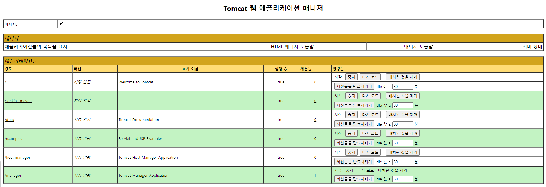 jenkins console output에서 deploy가 성공적으로 되었는지 확인한 후 tomcat에서 manager App에 접속(2번에서 설정한 ID:tomcat PW:tomcat)하여 원하는 페이지가 나오는지 확인합니다.
