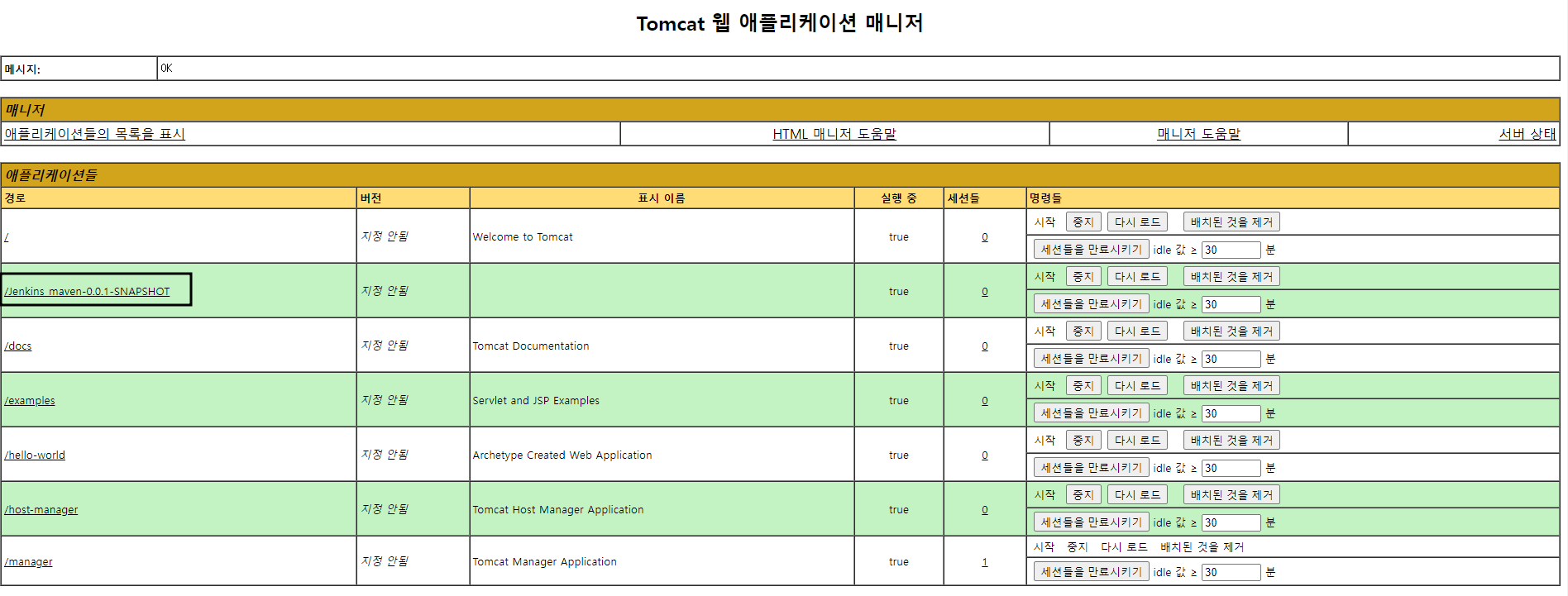 jenkins console output에서 deploy가 성공적으로 되었는지 확인한 후 tomcat에서 manager App에 접속(2번에서 설정한 ID:tomcat PW:tomcat)하여 원하는 페이지가 나오는지 확인합니다.