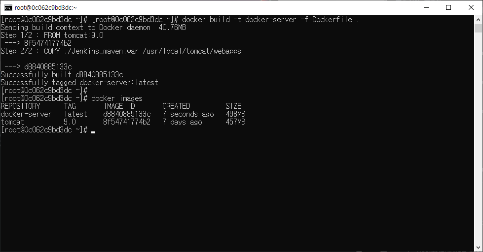 위 명령어를 통해 Dockerfile을 기준으로 image 이름이 docker-server인 이미지를 생성합니다.