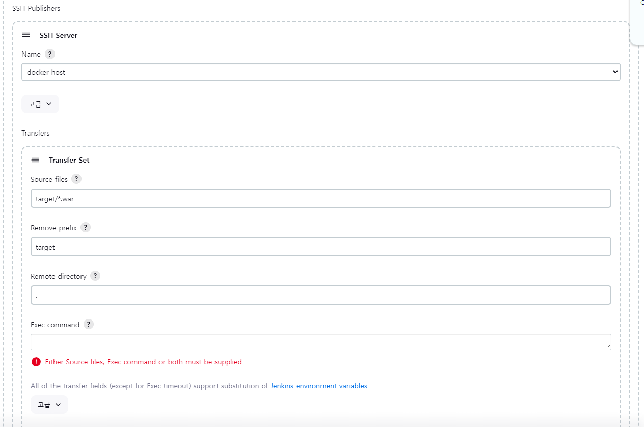 빌드 유발에서 Poll SCM 설정을 꺼주고 빌드후 조치에서 Deplay war/ear to a container를 삭제 하고 빌드후 조치 Send build artifacts over SSH 추가하고 빌드합니다.