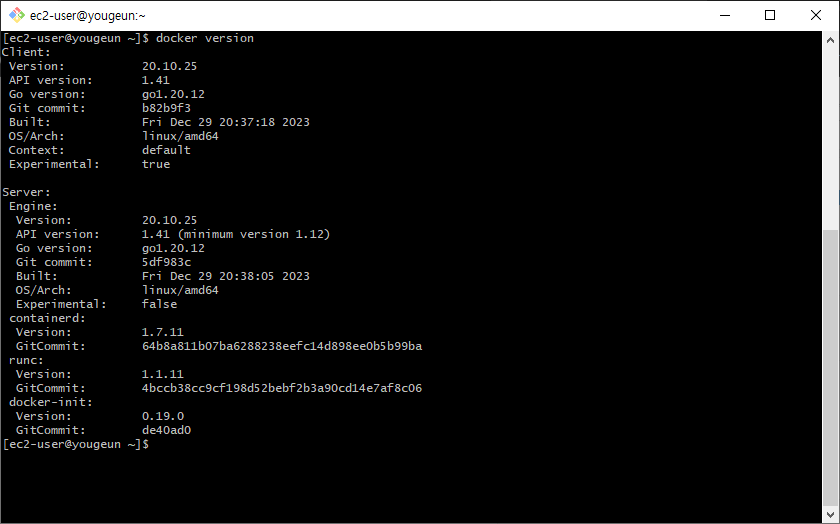 # docker group에 ec2-user 포함(재접속 시 포함됨)