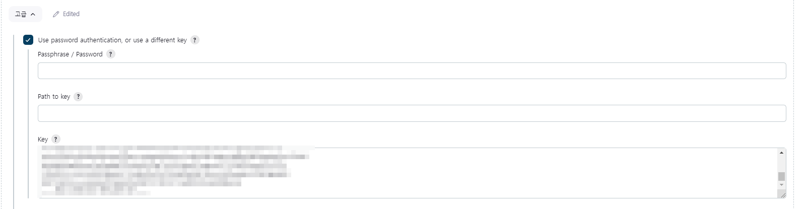 ssh publisher 설정에서 고급을 누르고 2-2에서 복사한 개인키를 Key 부분에 넣어줍니다.