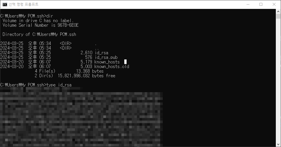 ssh 디렉토리에 들어가 id.rsa 파일에서 개인키를 복사합니다.