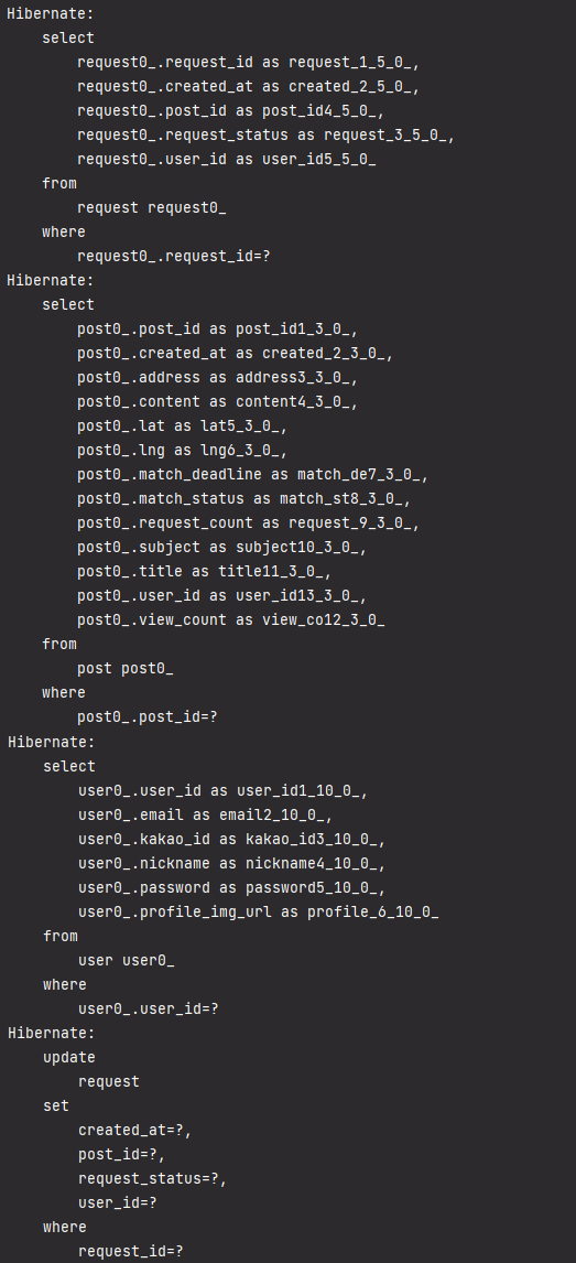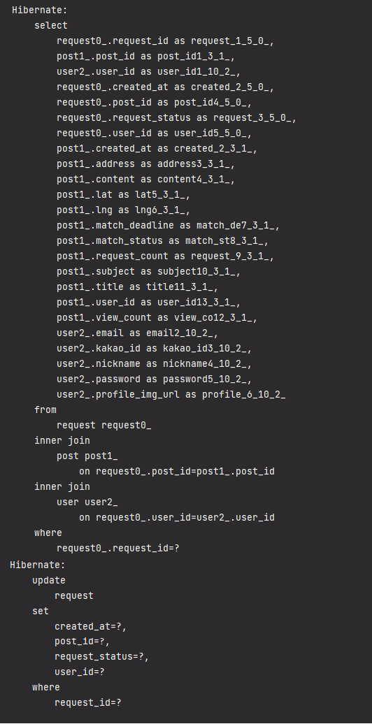 request entity의 Post와 User의 FetchType이 lazy로 설정되어있어 하위 entity인 Post와 User를 참조할 경우 왼쪽의 그림처럼 N+1 쿼리 문제가 발생한다. fetch join을 이용하여 findbyId함수를 위의 JPQL로 바꾸면 오른쪽의 그림처럼 N+1 문제가 해결된다.