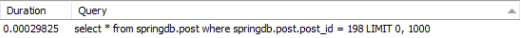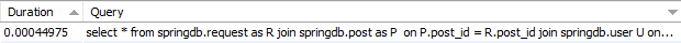 검색되는 rows 값은 3으로 동일하지만 N+1 쿼리 문제가 발생하는 쿼리들의 duration을 합쳐보면 0.00095175 , N+1 쿼리 문제를 해결한 쿼리는 duration은 0.00044975이다. 쿼리 속도가 2배 이상 개선된 것을 볼 수 있다.