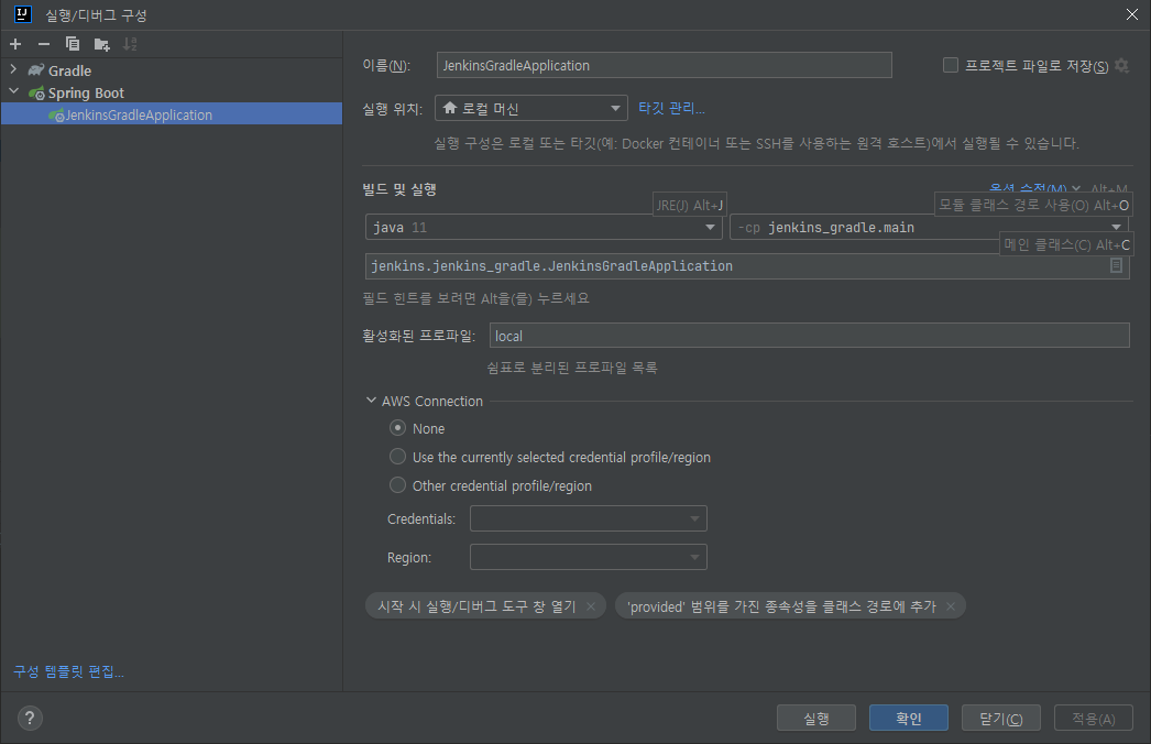 어떠한 개발환경이 쓰일지는 application.yml의 spring.prfile.active에서 선언하거나 intellij에서 구성편집에 들어가 활성화된 프로파일을 원하는 개발환경에 맞게 설정합니다. intellij의 개발환경이 먼저 적용되므로 주의하여 사용합니다.