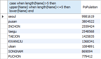 select case when length(Name)>5 then upper(Name) when length(Name)<=5 then lower(Name) end, PoPulation
