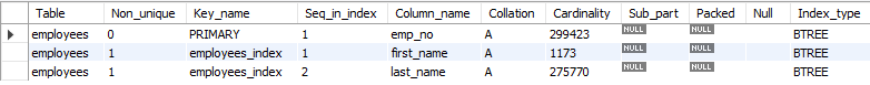 기본키로 설정된 emp_no으로 검색시 매우 적은시간으로 검색이 완료되는 것을 볼 수 있다.