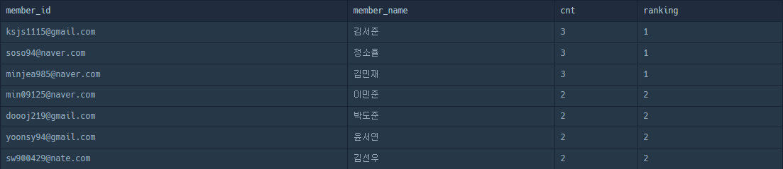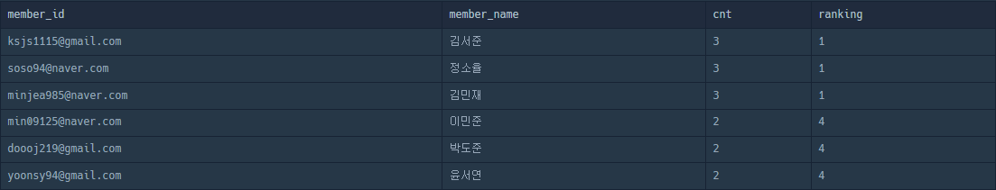 dense_rank() over (order by cnt desc): cnt column을 내림차순을 기준으로 dense_rank