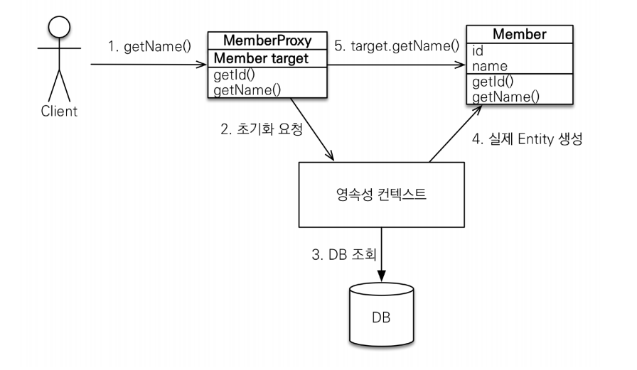 (3) 프록시 객체는 처음 사용할 때 한번만 초기화 되며 초기화 될 때 실제 엔티티로 바뀌는 것이아니라 프록시 객체를 통해서 실제 엔티티에 접근 가능하다.