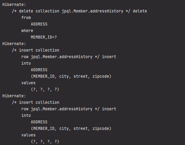 (2)값 타입 컬렉션에 변경 사항이 발생하면, 주인 엔티티와 연관된모든 데이터를 삭제하고, 값 타입 컬렉션에 있는 현재 값을 모두 다시 저장한다.