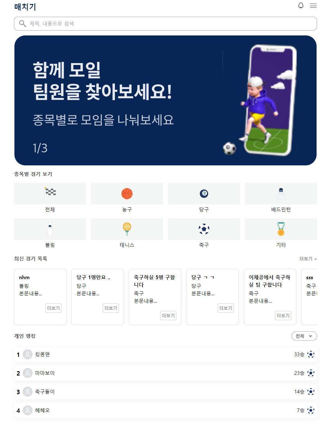 마지막 프로젝트인 실전 프로젝트가 시작되었다. 우리 조는 위치기반 스포츠 매칭 서비스인 match-gi를 기획했다. 카카오 맵을 활용 하여 현재 위치 근처에 있는 매칭들을 찾을 수 있어 편리함을 제공해주었다. 그리고 다른 스포츠 매칭 서비스와 달리 경기가 끝난 후 경기 결과를 기록할 수 있어 매칭을 할 때 더욱 다양한 정보를 제공해주고 매칭 하기로 약속한 사람들끼리 실시긴 채팅을 함으로써 더욱 구체적인 계획을 세울 수 있게 해 주었다.