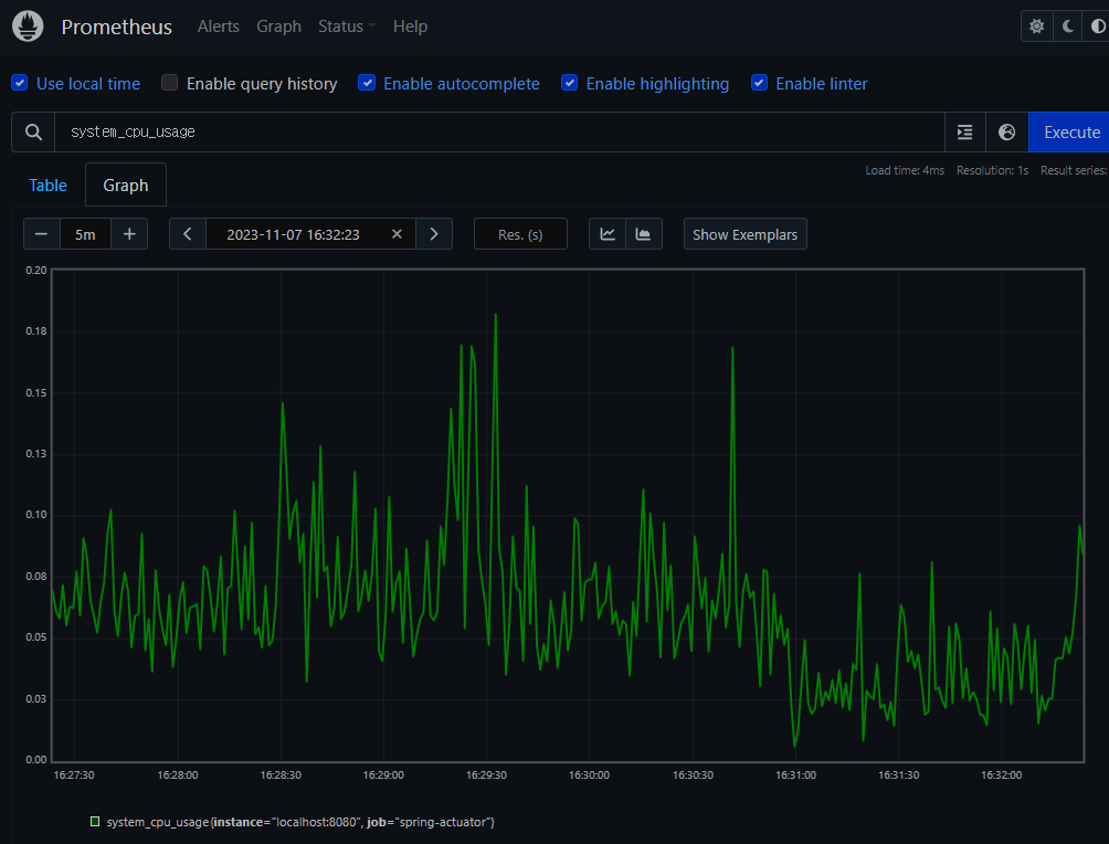 검색 창에 해당하는 metrics의 이름을 검색하면 그에 해당하는 metric을 테이블이나 그래프로 볼 수 있다 . 그리고 Evolution Time을 조정하여 원하는 시간의 정보를 얻을 수도 있다.