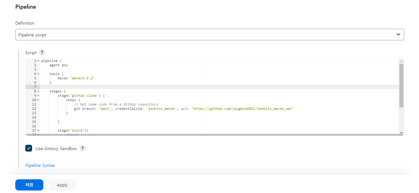 git branch: 'main', credentialsId: 'jenkins_maven', url: 'https://github.com/yougeun6021/Jenkins_maven_war'