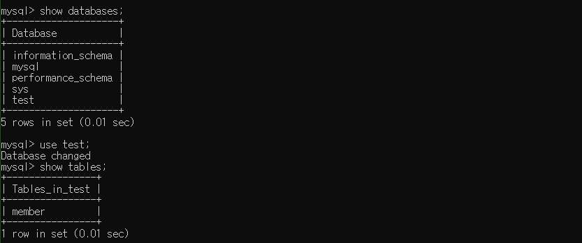 위의 명령어를 이용하여 member 테이블이 생성되었는지 확인합니다.