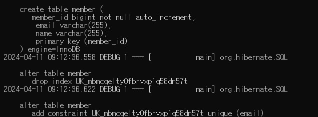 Member 테이블이 만들어지는 sql log를 볼 수 있도록 yml파일에 설정합니다.