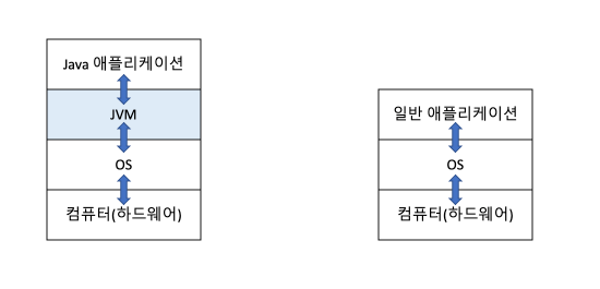 JVM은 자바 바이트코드를 실행하는 실행기로서 다른 언어들을 직접적인 기계어로 변환하는 것이 아니라 자바언어를 JVM이 이해하는 자바 바이트코드로 번역한다. 그러므로 JVM만 깔려 있으면 밑의 그림과 같이 자바 애플리케이션은 JVM 하고만 상호작용을 하기 때문에 OS와 하드웨어에 독립적이라 다른 OS에서도 프로그램의 변경 없이 실행이 가능하다.